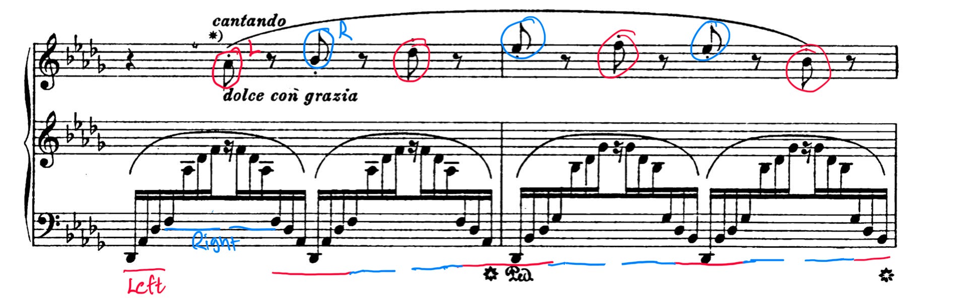 The image above shows why this is so demanding. The first few notes are played by the left hand, the next few by the right, and the melody line at the top alternates hands with each note — right, then left, then right. So here you play first the red part with the left, then blue part with the right and while the left hand plays, the right hand moves over the left hand and hits the Ab before rushing back to hit the same notes it just played.